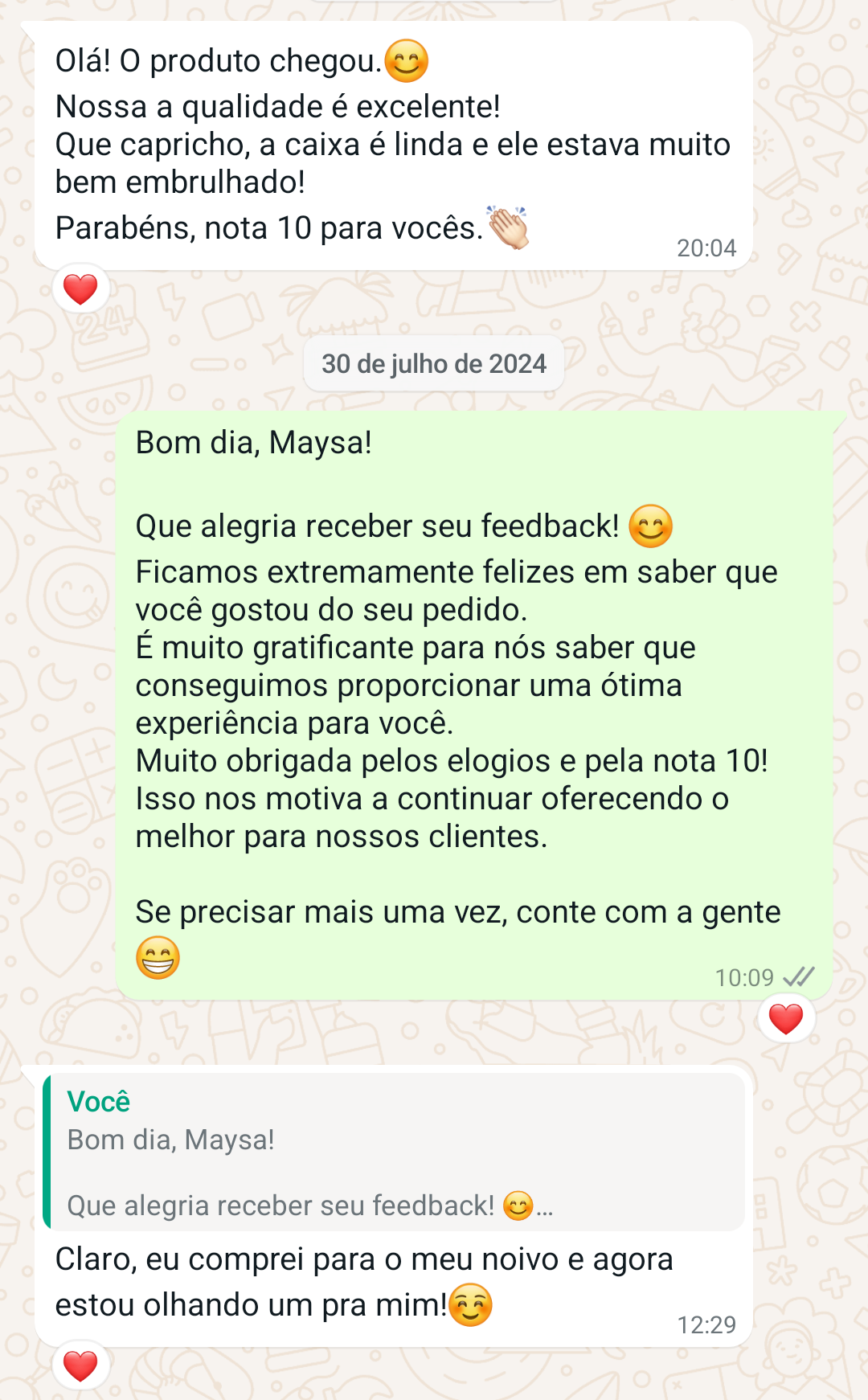 Do presente ao desejo pessoal! A Maysa comprou para o noivo e ficou tão encantada com a qualidade, a embalagem e o capricho que já está escolhendo um para ela. Esse é o feedback que nos move!