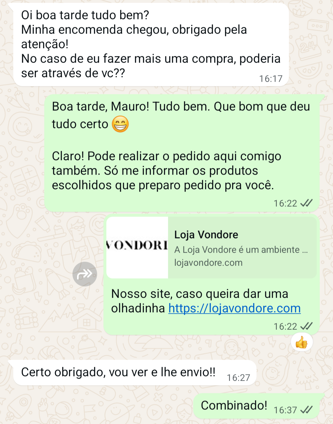Construindo relações de confiança. O Mauro não só amou o pedido e a nossa atenção, como já nos procurou para facilitar sua próxima compra. Estamos sempre prontos para ajudar!