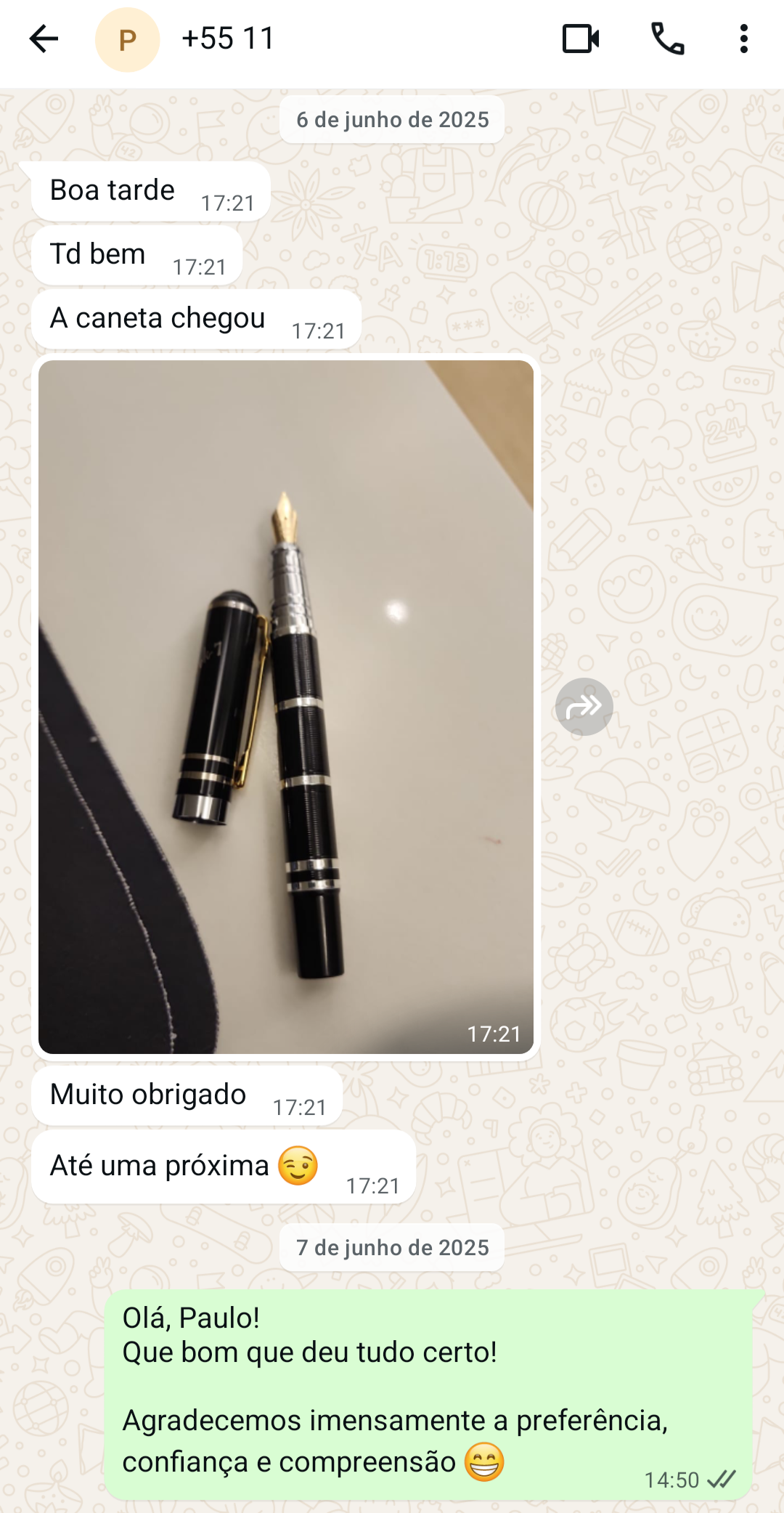 Elegância que se confirma na entrega. O Paulo nos avisou que sua caneta chegou perfeitamente e já sinalizou um 'Até uma próxima'. Agradecemos a confiança!